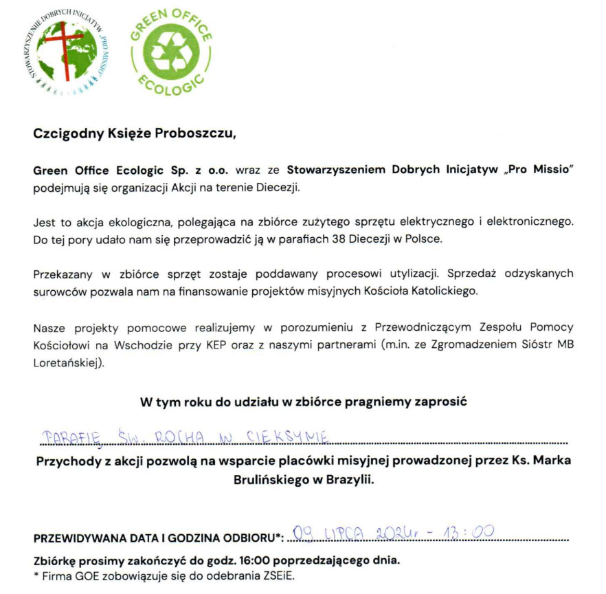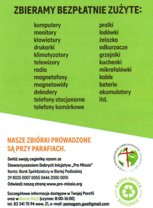 Stowarzyszenie Dobrych Inicjatyw “PRO MISSIO” oraz firma Green Office Ecologic zapraszają do udziału w zbiórce elektrośmieci.